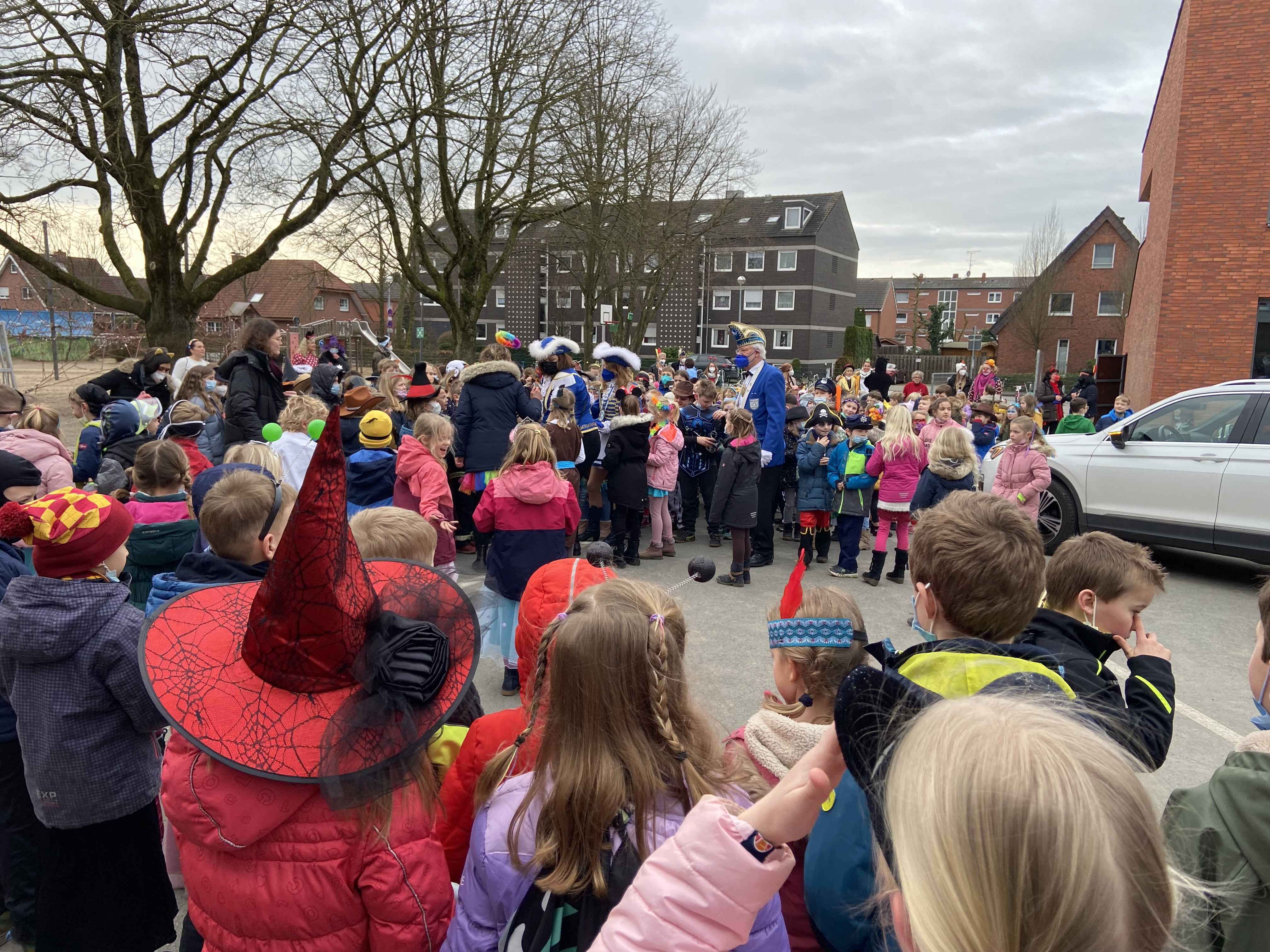 Am 24.02.2022 ereignete sich etwas besonderes an der Marienschule: Karneval! Dieser Donnerstag begann wie gewöhnlich um 7:50Uhr. Ungewöhnlich war, wer da alles auf den Schulhof kam: Manche Kinder waren als Tiere, andere als Filmcharaktere, Feen, Prinzessinnen oder Polizisten verkleidet. Auch die Lehrerinnen und OGS Mitarbeiter waren geschminkt und verkleidet. Die Klassenräume hatten die Kinder und Lehrer ebenfalls bunt geschmückt. Um 8:45h trafen sich alle auf dem Schulhof, um den Karnevalsprinzen und seine Gefolgschaft lautstark mit lustigen Liedern zu begrüßen.  Nach der Pause ging es zurück in die Klassen, wo gespielt und getanzt wurde. In einem kurzen Interview erfuhr ich, dass es in einigen Klassen besonderes Frühstück gab und alle viel Spaß hatten. Einer Schülerin gefiel das Obstsalat-Spiel am besten. Zudem gab es ein Theaterstück vom Figurentheater „HillePupille“, bei dem herzlich gelacht wurde. Auch in der OGS wurde fröhlich weiter gespielt und gefeiert. Das war ein toller Tag!