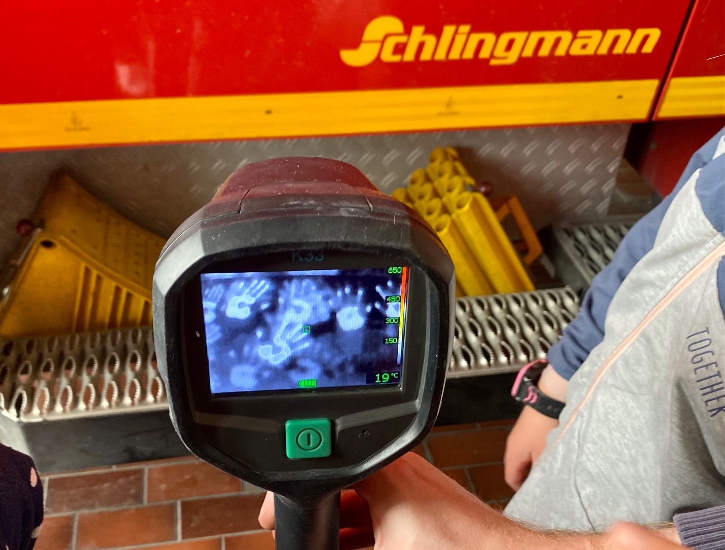 Am letzten Freitag waren wir, die Klasse 3d, bei der Feuerwehr. Nach der großen Pause sind wir losgegangen und waren schon nach 15 Minuten an der Feuerwache. Dort hat uns ein Feuerwehrmann, der Benedikt hieß, hereingebeten. Zuerst hat uns Benedikt erklärt, was die Feuerwehr alles macht: bergen, retten, löschen und schützen. Anschließend hat er uns die Feuerwehrhalle gezeigt. Wir durften eine Feuerwehrjacke und die Handschuhe anziehen und sogar den Helm durften wir aufsetzen. Benedikt hat uns dann erzählt, was die Feuerwehr an Ausrüstung braucht. Sie brauchen Atemschutzmasken und Sauerstoffflaschen, Helme mit Haarschutz, feuerfeste Kleidung und Stiefel. Dann hat Benedikt uns ein Feuerwehrauto gezeigt. Da konnte man ein Fach öffnen, in dem viele Schläuche waren.  Die Schläuche waren 20 m lang. Hinter dem Fach gab es noch ein zweites Fach, in dem eine riesige Schere lag, mit der Menschen aus Autos gerettet werden können. Als wir uns alles angeschaut hatten, hat Benedikt die Klappen wieder sorgfältig zugemacht. Dann sollten wir unsere Hände ganz schnell aneinander reiben und der Feuerwehrmann hat ein Wärmegerät geholt. Damit konnte er messen, wie warm unsere Hände sind. Außerdem haben wir mit ganz vielen Händen das Feuerwehrauto angefasst und mit dem Wärmegerät konnte man unsere Fingerabdrücke auf dem Auto sehen.