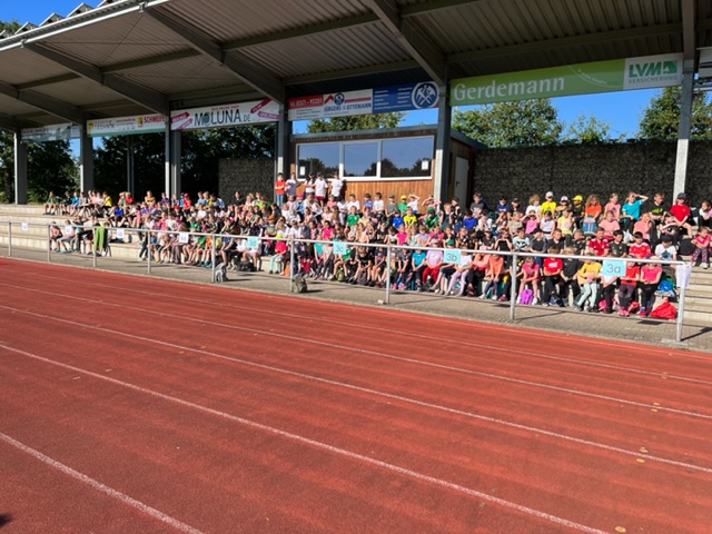 Am Ende des Vormittags durften die Erst- und Zweitklässler noch jeweils eine Runde ganz alleine um den Sportplatz rennen und zeigen, wie schnell sie sind. Den Höhepunkt erzielte am Ende der Staffellauf. Je zwei Mannschaften bestehend auf Lehrern und OGS-Mitarbeitern traten gegen die Sportskanonen der dritten und vierten Jahrgänge an. Was für eine Stimmung. Natürlich haben die Schüler gewonnen. Wer sonst. Glückliche und gut zufriedene Schüler gingen – vielleicht sogar mit